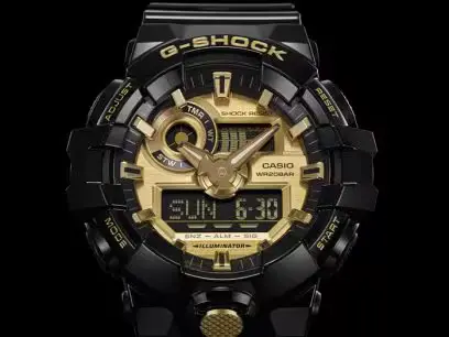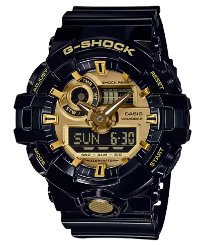 A model with garish colors from G-SHOCK, which continues to evolve in the pursuit of toughness. Uses as the base model the GA-700, with three-dimensional hour and minute hands and powerful indices created using a unique resin-molding technology. A lineup of black and gold models reminiscent of accessories and fashion items that b-boys might wear. The whole body has a glossy finish, giving it a tough, energetic style. A model with colors the look great with street fashion based on a standard GA-700 G-SHOCK model.